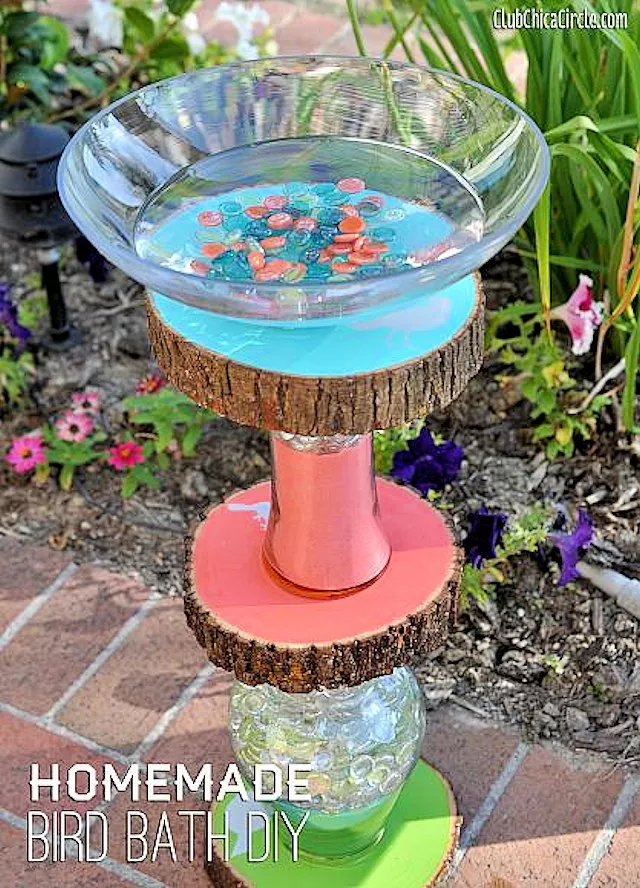 Perhaps you already have a heavy concrete birdbath that is showing its age with chips, nicks, or cracks. Give it new glamour with a simple coat of concrete and glittery jewels, with a smaller colorful basin in the middle for a fun focal point. You can even leave the smaller basin loose in the bath so it can be removed for easy cleaning whenever needed.